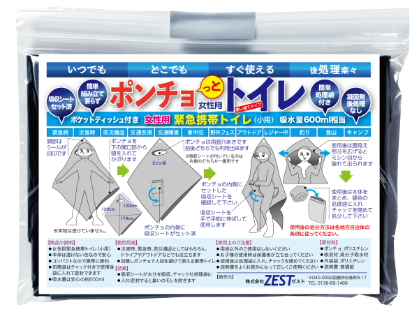 女性用緊急トイレ ポンチョっとトイレ(小用) 吸水量600ml 緊急時、災害時に役に立つ いつでも どこでも すぐ使える 後処理楽々 組み立てなし